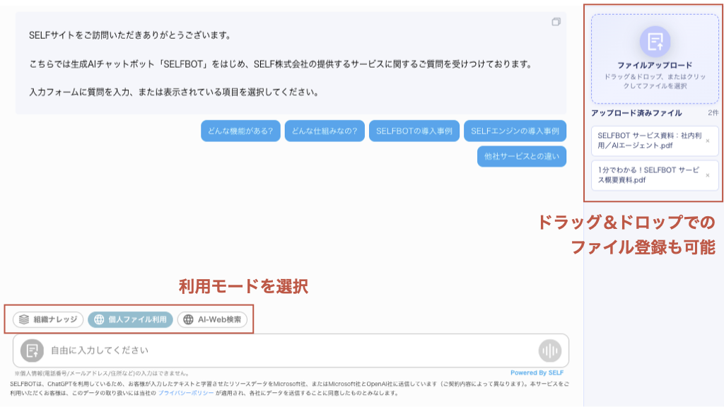 AI-Web検索機能とファイルアップロード機能は、SELFBOT管理画面からアクセス可能なチャットルームでご利用いただける機能です。詳しくは下記をご覧ください。