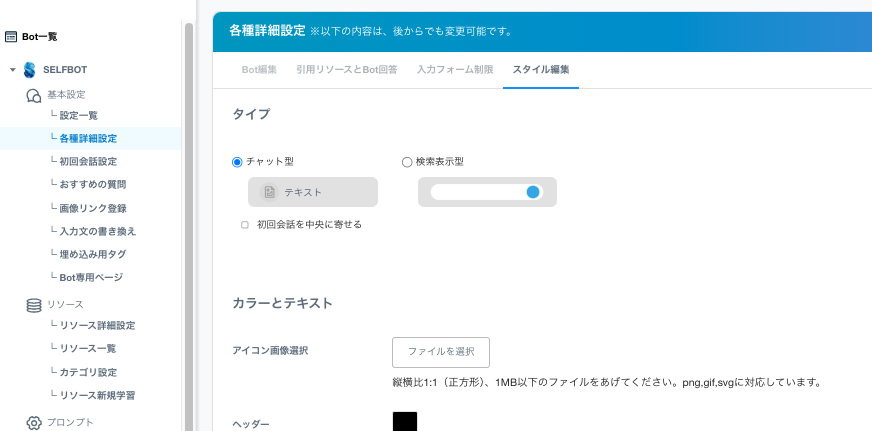 - 「Bot編集」「引用リソースとBot回答」「入力フォーム制限」「スタイル編集」の各画面が「各種詳細設定」に統合されました。タブを切り替えて各項目を編集できます。