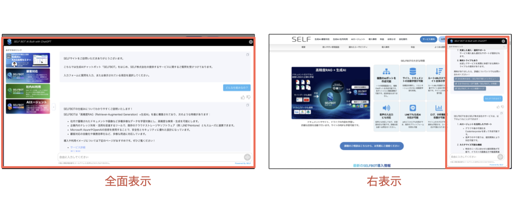 WEBページにSELFBOTを表示する際、チャット画面を画面全体に大きく表示する「全面表示」と、画面右側にコンパクトに表示する「右表示」から選択できるようになりました。